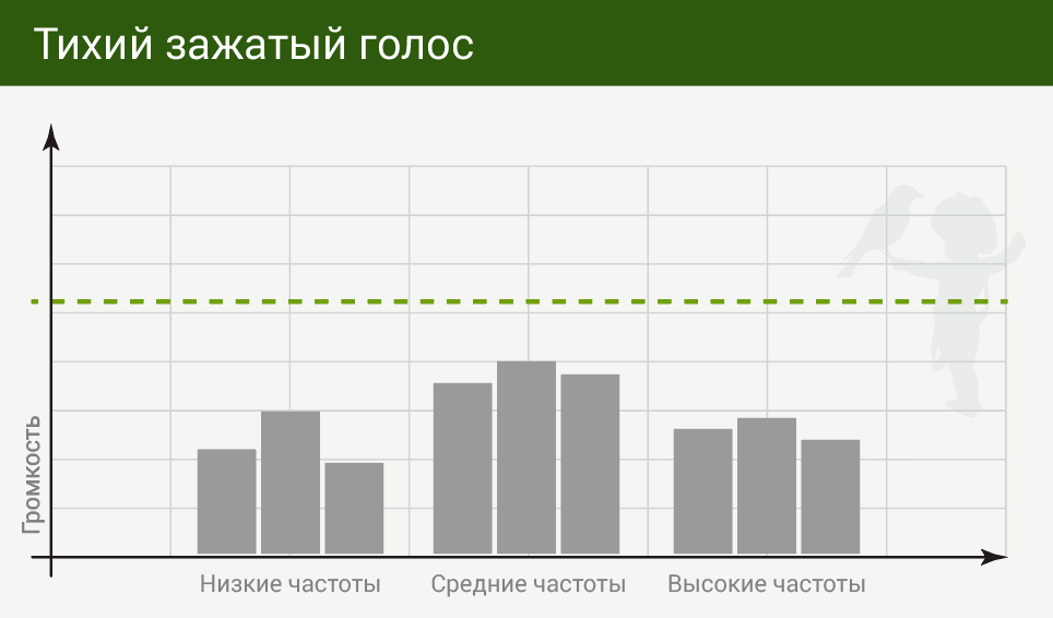 Обратите внимание, набор частот не меняется. Меняется только их громкость, а именно от нее зависит восприятие голоса. Самая печальная ситуация, когда тембр в целом зажат, и потенциально красивый и сильный голос звучит тихо, слабо и тускло