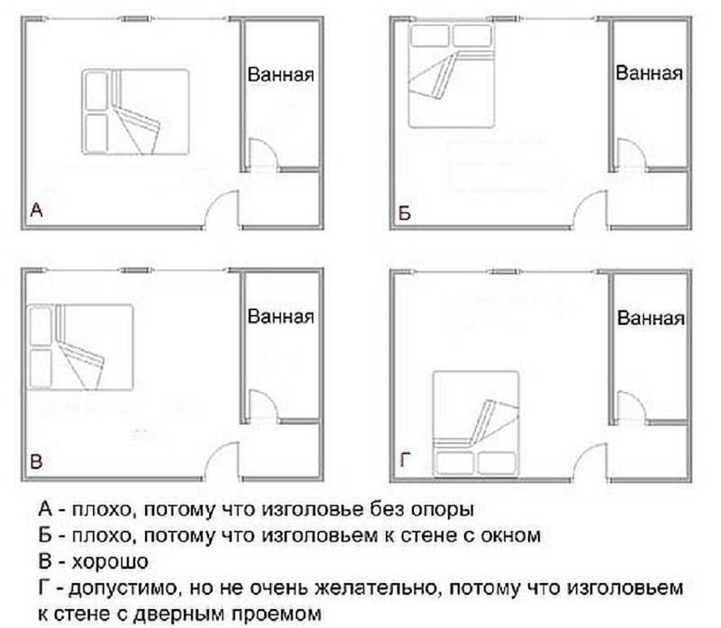 - Стена, возле которой стоит вплотную кровать – изголовьем или боковой стороной, ни в коем случае не должна быть смежной с санузлом или ванной.