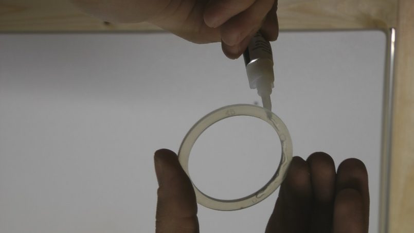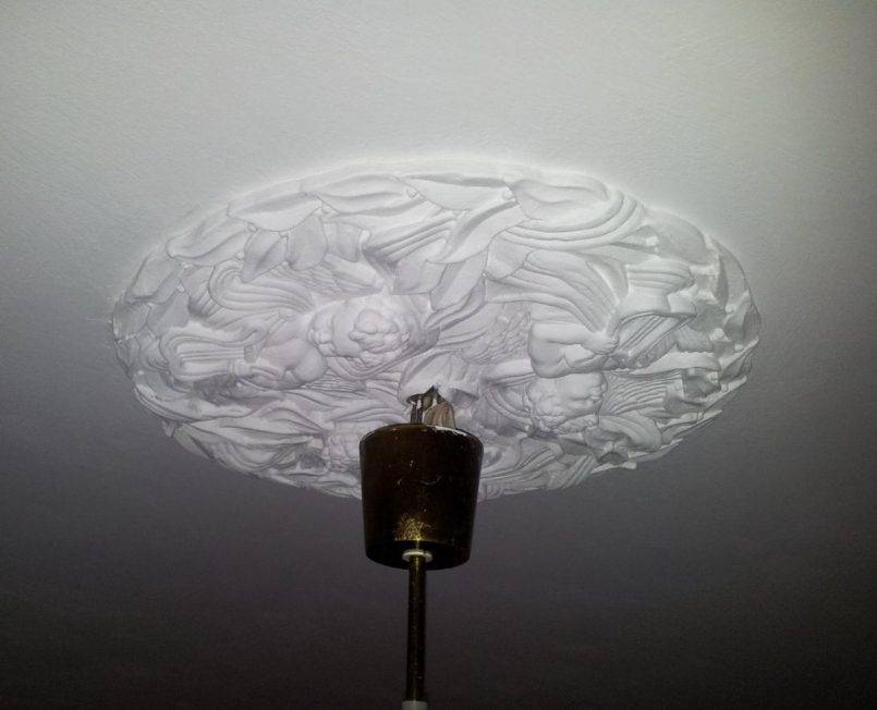 Необходимо приобрести обычный лист ПВХ, из которого понадобится вырезать кольцо диаметром немного больше основания светильника. Далее люстра прикладывается к потолку и обводится вокруг специальным маркером. Именно к этому контуру необходимо приклеить самодельное протекторное кольцо.