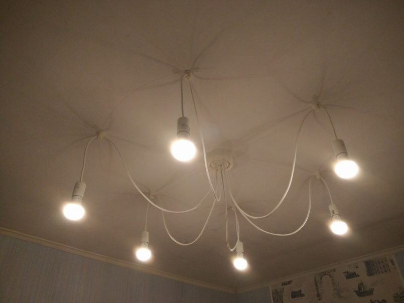 В подобных люстрах нельзя использовать лампы накаливания, ведь их температура негативно сказывается на состоянии полотна, что будет заметно уже через пару месяцев.