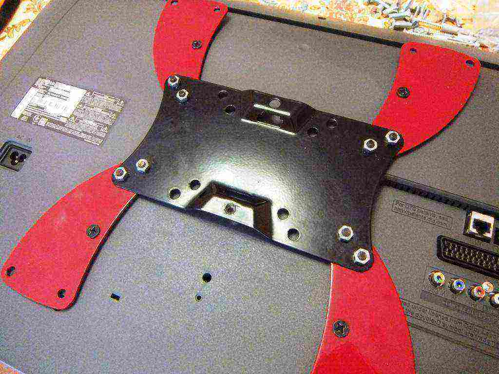 Итак, приступаем к работе. Нам необходимо выполнить два отверстия при помощи дрели для крепления к ТВ и по одному в верхней части (для спицы). Готовые детали нужно прикрепить к корпусу телевизора на винтах М4.