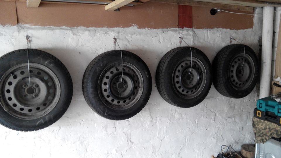 Колеса с покрышками можно подвешивать за среднее отверстие диска. Для этого нужно специальное приспособление с крючками. Резина не должна прикасаться к стене, и соседним предметам. Периодически колеса ротировать, поворачивать на 90 градусов каждые 4-8 недель.