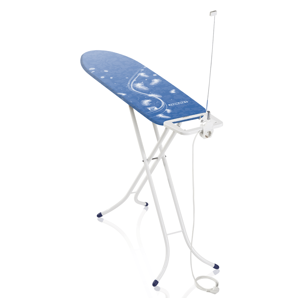 Мощная модель от производителя из Германии выполнена из металла, ножки крепкие, оснащены насадками, защищающими изделие от скольжения, а пол от повреждений. Размер доски 123х46 см, это стандартная модель для ухода за бельем дома. Высота регулируется от 47 до 97 см, можно также установить положение для глажки сидя. Модель дополнена подставкой для утюга и парогенератора, гладильным рукавом, встроенной розеткой, чтобы пользователи не переживали о месте ее установки рядом с источником питания. В комплекте есть съемный чехол из хлопка с антипригарным покрытием.