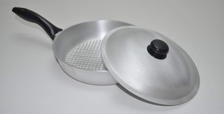 - Алюминиевые. Изделия из этого металла имеют меньший вес по сравнению с чугуном, а на поверхность нанесено антипригарное покрытие. Прогрев наступает очень быстро, однако такие сковороды чувствительны к высокой температуре, под влиянием которой защитный слой может разрушиться.