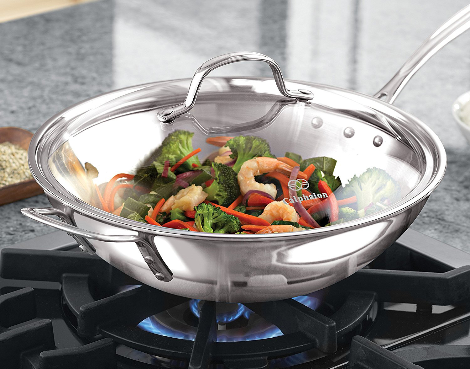 Золотая середина между алюминием и чугуном. Сталь быстро прогревается, но хорошо держит тепло. Вес умеренный, поэтому подойдет для «зрелищной» готовки с подбрасыванием еды.