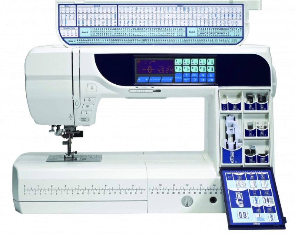 Bernina В 350. Выполняет 85 операций. Подходит для работы с кожей и толстыми тканями. Оснащена дисплеем, облегчающим регулирование настроек. В комплектации приставной столик.