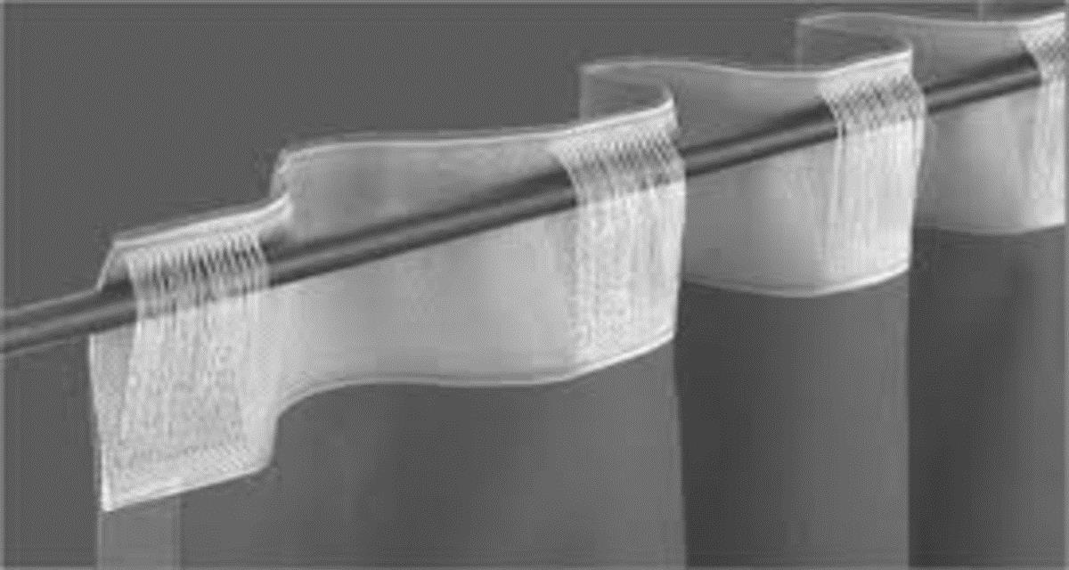- Складки «гильзы» или «волна» представляют собой несколько рядов округлых складок, ширина которых – 10, а коэффициент сборки – 2. Пришивается к долгим гардинам или портьерам и навешивается с помощью крюков. Имеет на тесьме три корда плюс такое же количество карманов.
