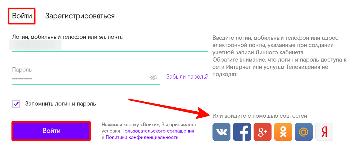 Если вы хотите войти в личный кабинет с помощью адреса электронной почты или логина, то следует ввести эти данные в первом поле. Система автоматически распознаёт указанную информацию и сверяет её с данными в базе. А также авторизация в ЛК доступна с помощью социальных сетей.