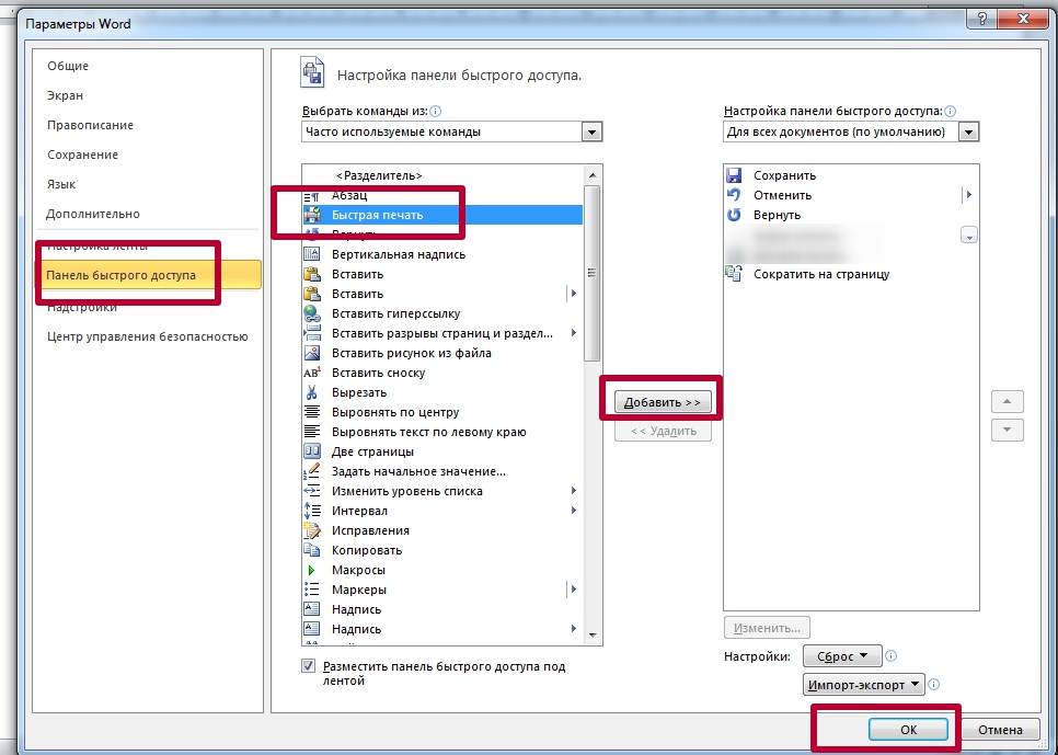 Потом слева в перечне функций найдите пункт «Быстрая печать» и кнопкой по центру перенесите направо. Подтвердите свои действия кнопкой «OK».