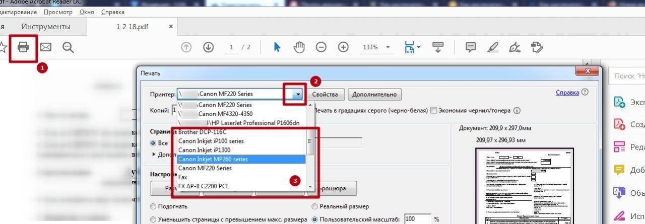 Во всплывающем списке с принтерами убедитесь, что выбрано нужное устройство.