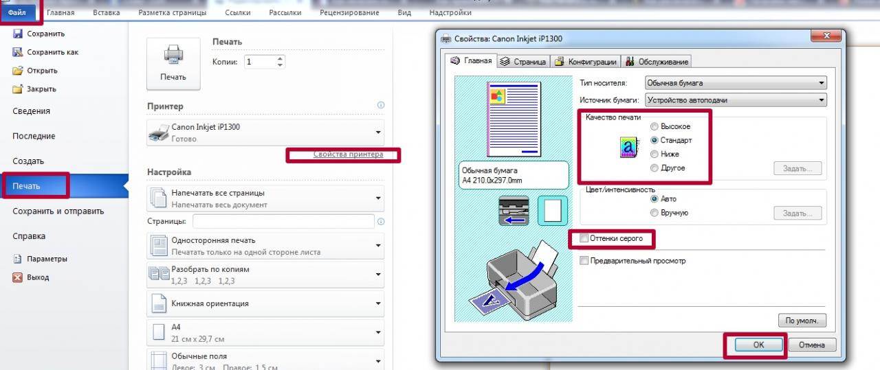 - В окне, которое открылось отметьте пункт «Оттенки серого» для ч/б распечатывания или настройте качество цветной печати.