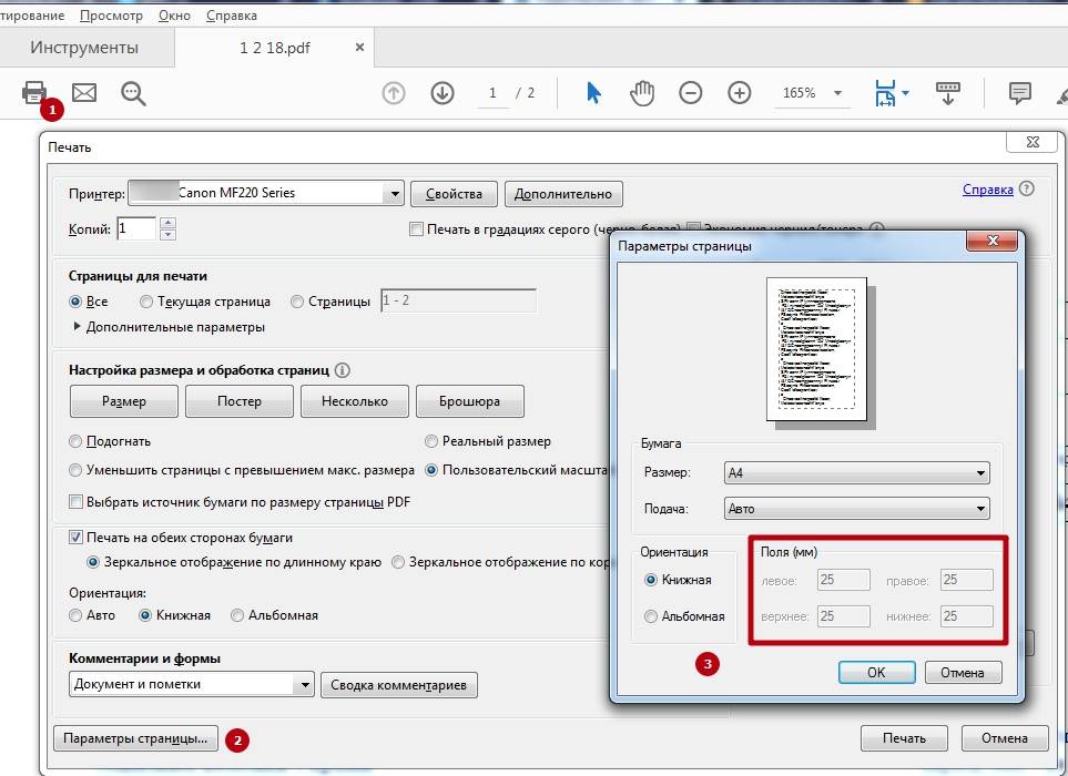 В окне предпросмотра печати (стрелка 1 на скриншоте ниже) вы увидите страницы, уже подогнанные под выбранный размер бумаги и выбранные поля, а так же количество страниц, получившиеся при выбранных настройках (стрелка 2 на скриншоте ниже).