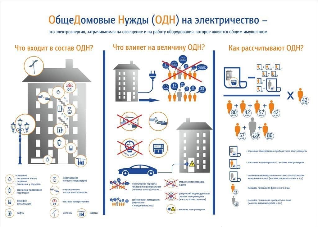 Еще один вопрос – как рассчитать ОДН по электроэнергии? Общий счётчик ведёт учёт электроэнергии на освещение лифта, подъезда и лестниц и других совместных расходов.