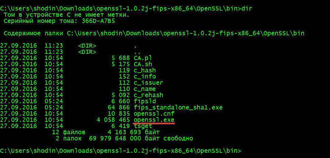 Также можно загрузить пакет openssl для ОС Windows. Качаем архив под нужную архитектуру процессора отсюда, распаковываем его и переходим в консоли в каталог bin. Нам нужен файл openssl.exe: