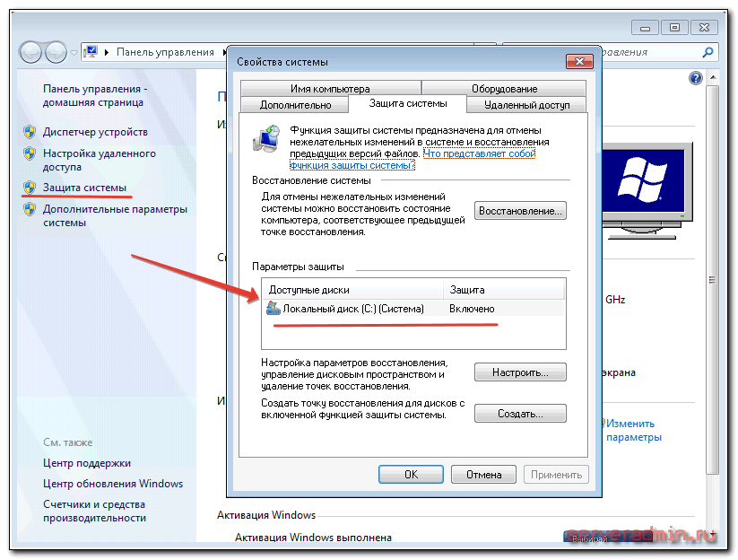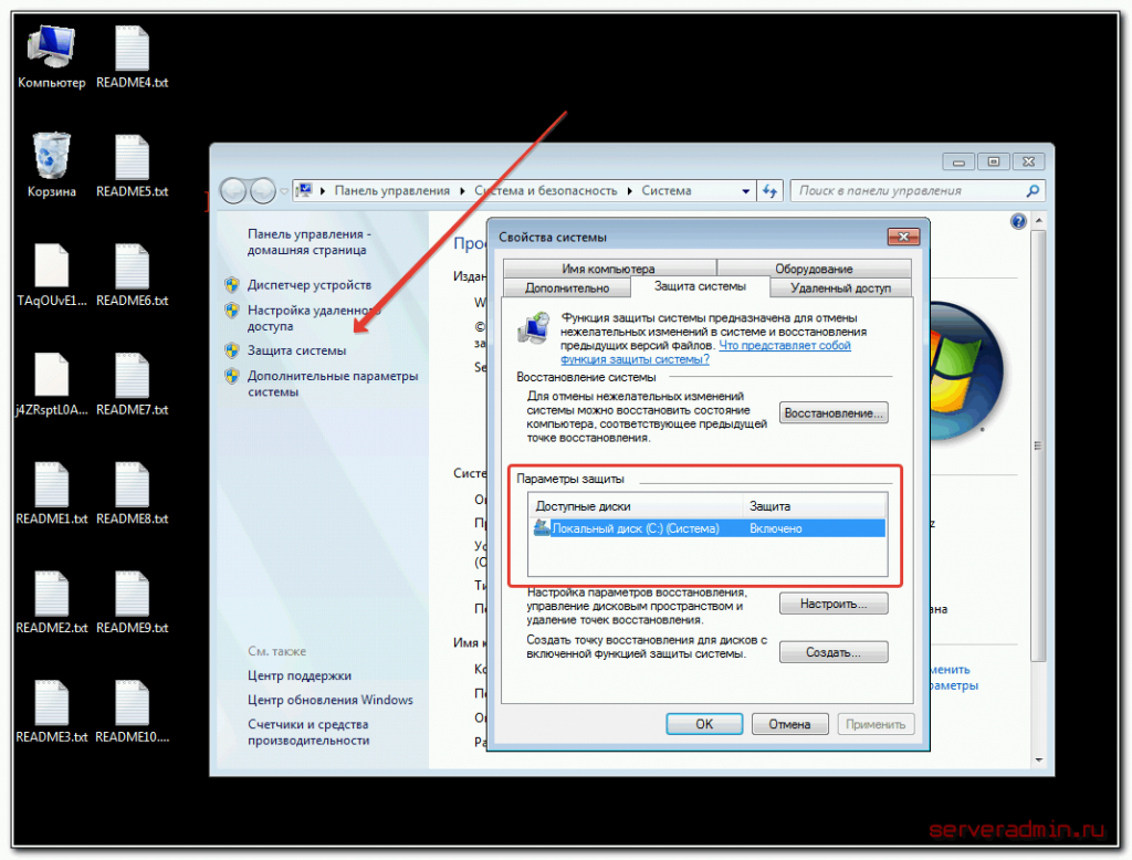 После этого загружаемся в зараженной системе и проверим, включены ли у нас теневые копии. Этот инструмент по-умолчанию работает в windows 7 и выше, если вы его не отключили вручную. Для проверки открываем свойства компьютера и переходим в раздел защита системы.