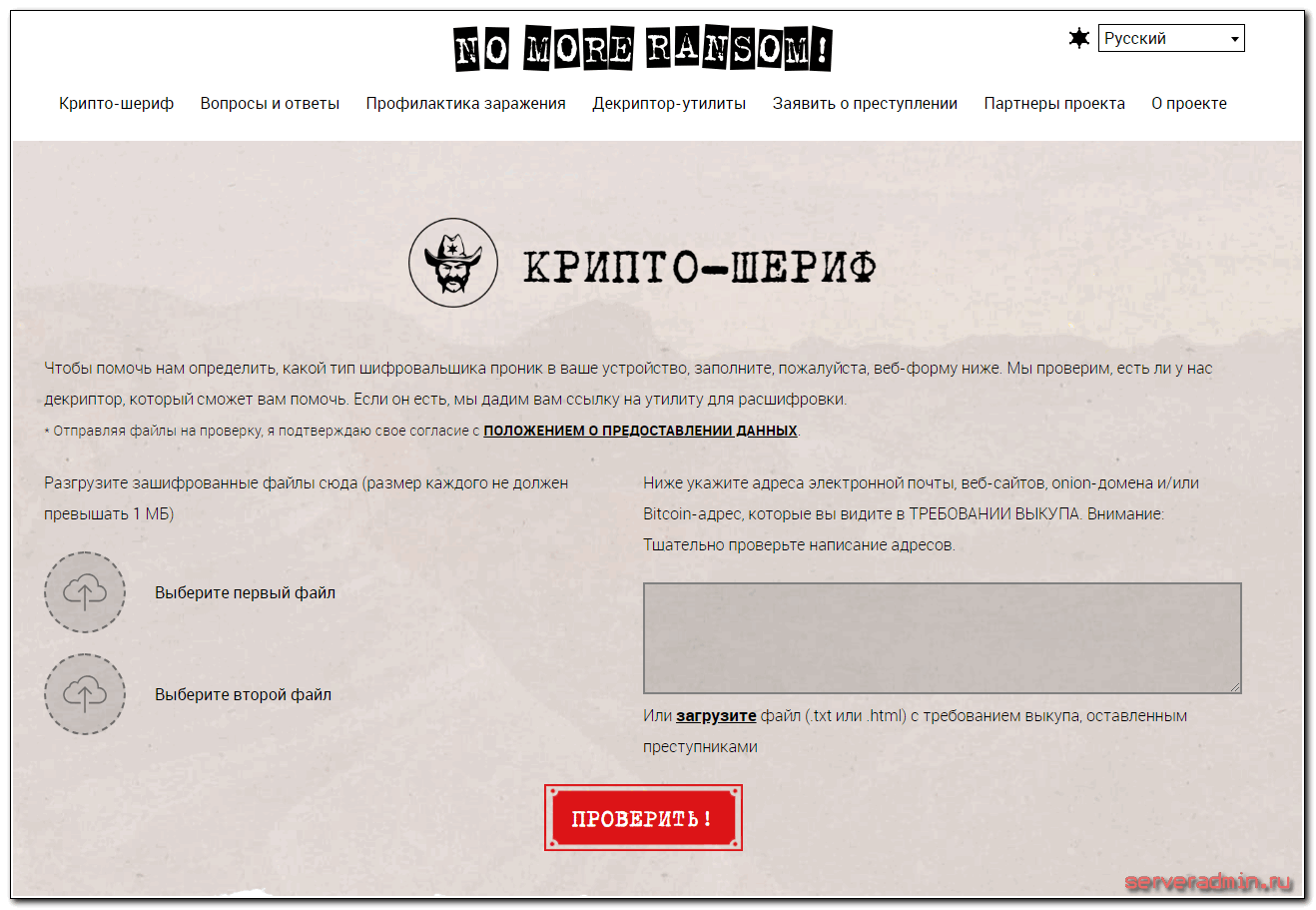 - Откроется страница «Крипто-шериф», где можно загрузить примеры зашифрованных файлов размером не более 1 Мб (рекомендую загружать не содержащие конфиденциальных данных), а также указать адреса электронной почты или сайтов, на которые мошенники требуют выкуп (или загрузить файл readme.txt с требованием).
