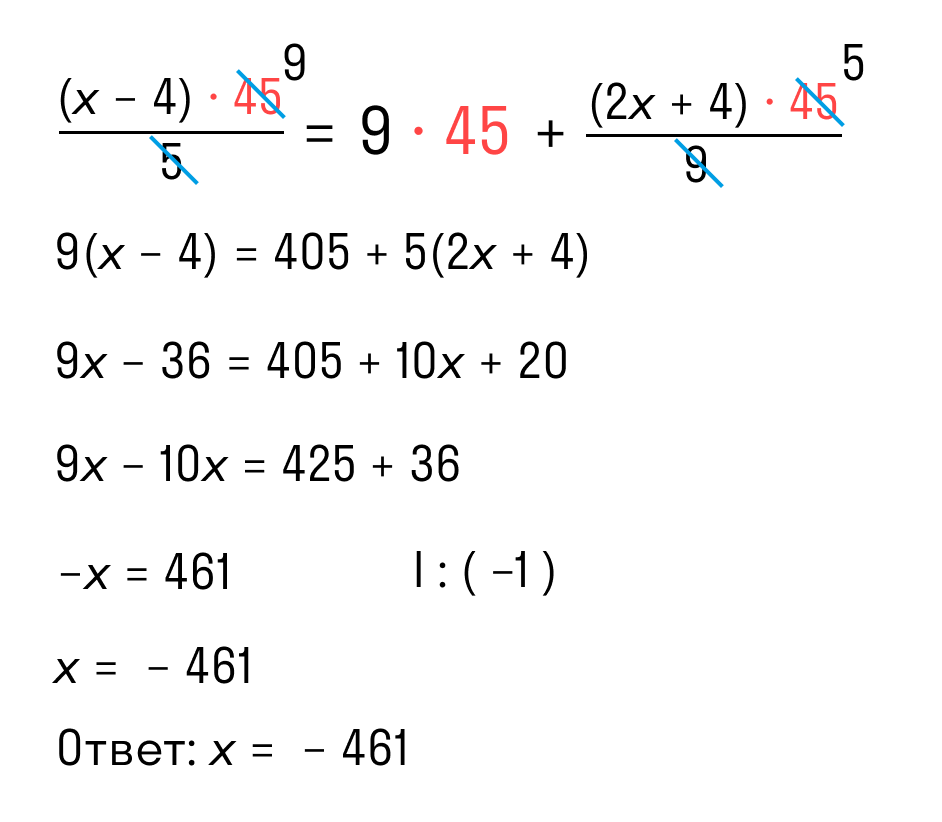 Ищем самое маленькое число, которое делится на 5 и 9 и без остатка — 45 как раз подходит. Умножаем каждый член уравнения на 45 и избавляемся от знаменателей. Вуаля!
