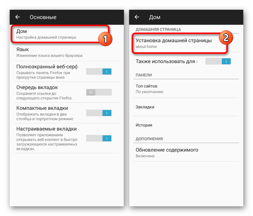 Здесь необходимо выбрать пункт «Дом» и тапнуть по строке «Установка домашней страницы».