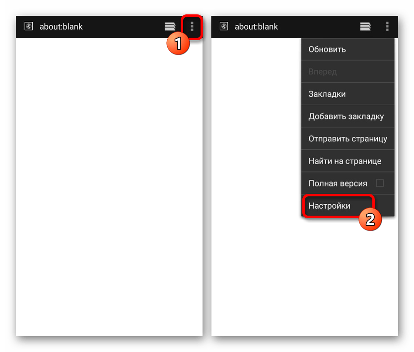 - Несмотря на возможные отличия приложения Браузер в зависимости от версии Android и производителя устройства, установка стартовой страницы происходит одним и тем же способом. Для этого первым делом разверните главное меню кнопкой в правом верхнем углу и выберите пункт «Настройки».