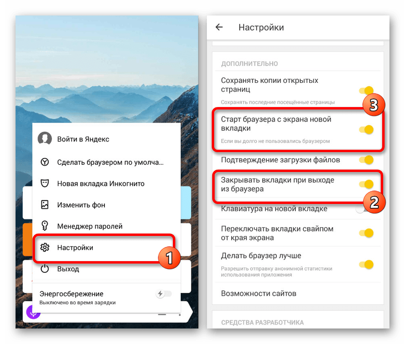 Для этих целей разверните главное меню, выберите «Настройки» и найдите блок «Дополнительно». Здесь необходимо включить функцию «Закрывать вкладки при выходе из браузера» и «Старт браузера с экрана новой вкладки».