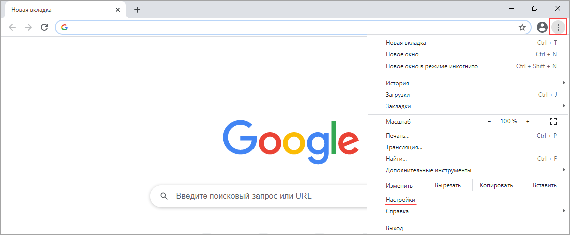 Нажмите на кнопку с тремя горизонтальными линиями в самом верху браузера с правой стороны. Из списка выберите пункт «Настройки».