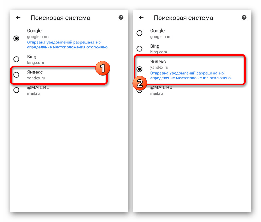 - На дисплее появится список с возможными поисковиками, из которого нужно выбрать «Яндекс».