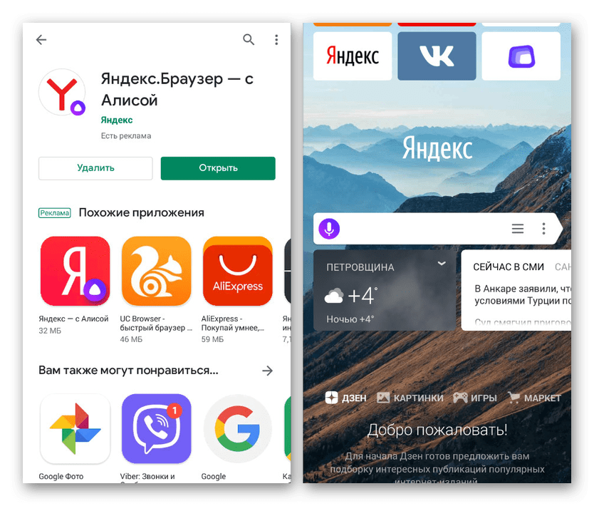 В данном веб-обозревателе поисковая строка от Яндекс установлена по умолчанию. Достаточно установить приложение из Play Marketa на телефон и предоставить необходимые разрешения. Однако стоит помнить, что браузер запустит последнюю открытую страницу, поэтому для перехода на стартовую страницу потребуется нажать кнопку.