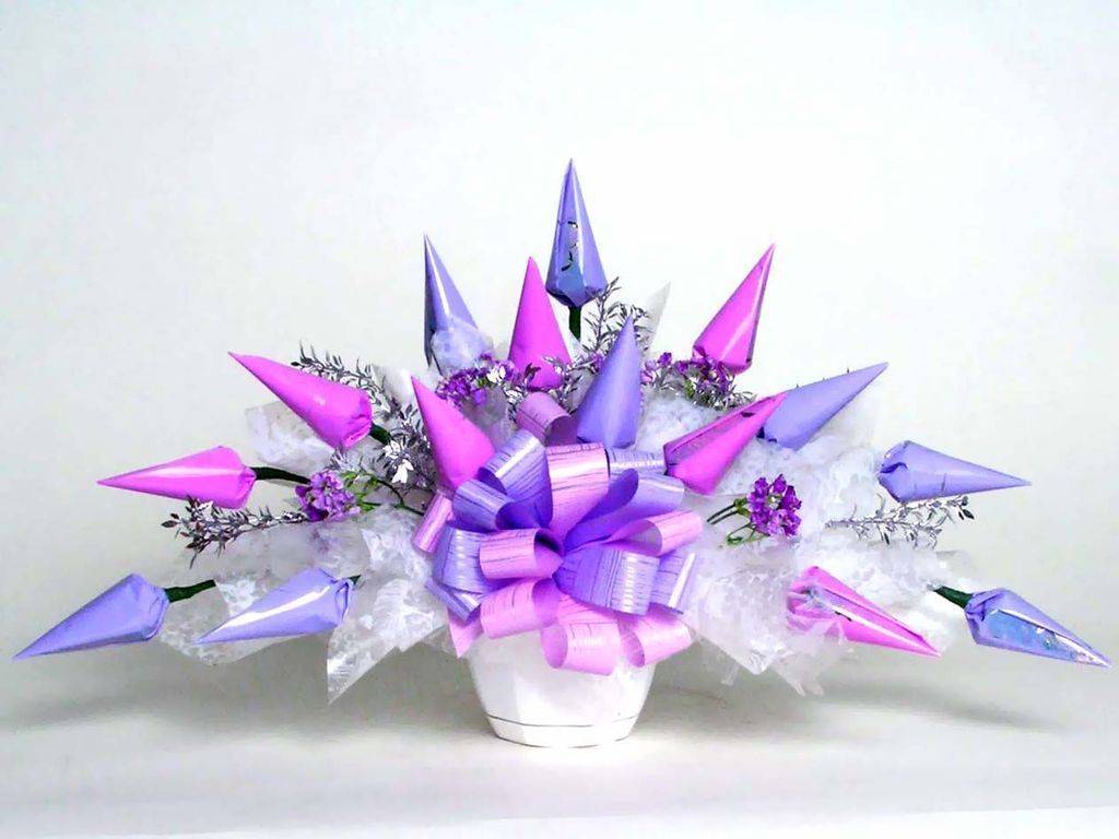 Вставляем цветы из гофрированной бумаги и конфет в пенопласт симметрично. Сначала вставляем 6 больших цветков в два ряда (по три с одной и другой стороны ручки). В серединку вставляем цветы с более короткими стеблями, а по краям вставляем с самыми короткими. Также вставляем пучки тонких искусственных листьев и распределяем их между цветами, чтобы заполнить пространство внутри.