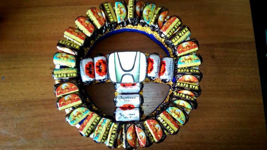 Готовый руль из конфет можно упаковать в прозрачную флористическую пленку и украсить атласной лентой. Также можно комбинировать не один вид конфет, главное подобрать так, чтоб они подходили по дизайну, цветовой гамме.
