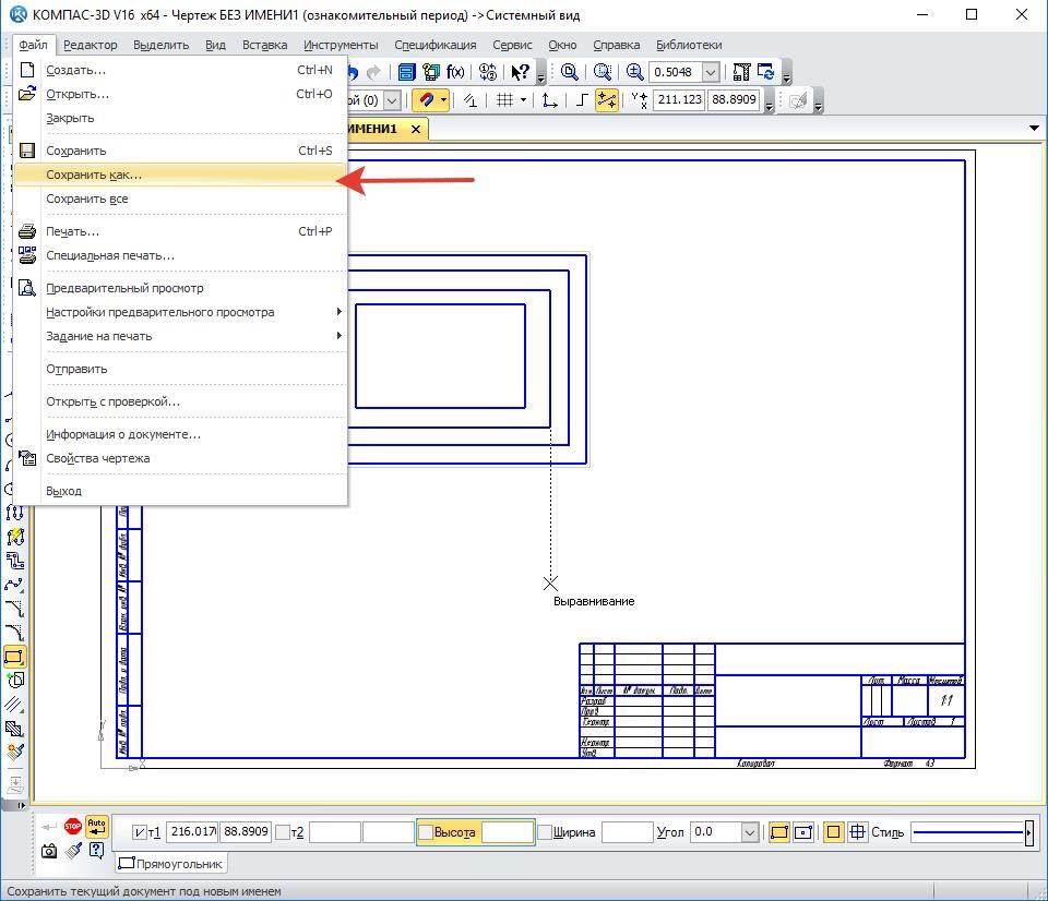 Для сохранения созданного чертежа нажмите на «File» — «Save as».
