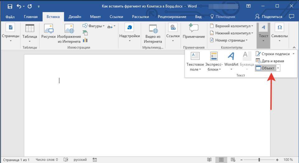И все-таки существует метод, с помощью которого вы можете вставить фрагмент или чертеж из Компаса-3D в Ворд в том же виде, в каком он находиться в САПР-программе. Объект будет доступен для редактирования непосредственно в текстовом редакторе, точнее, он будет открываться в отдельном окне Компаса.