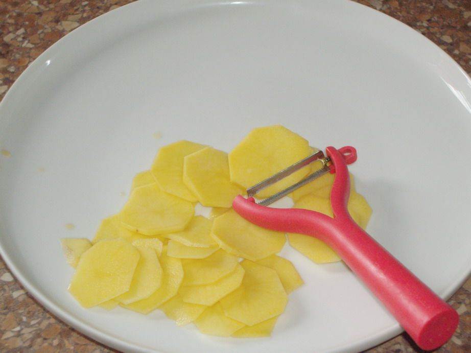 Тщательно чистят картофель, избавляются от испорченных продуктов, вырезают все изъяны. Далее моют картофель и нарезают его тоненькими кружочками.