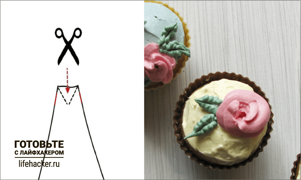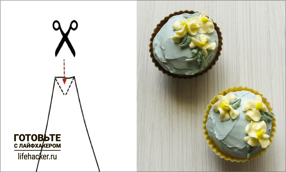Для первых крошечных цветов подверните кончик кондитерского мешка и надрежьте сгиб вертикально.
