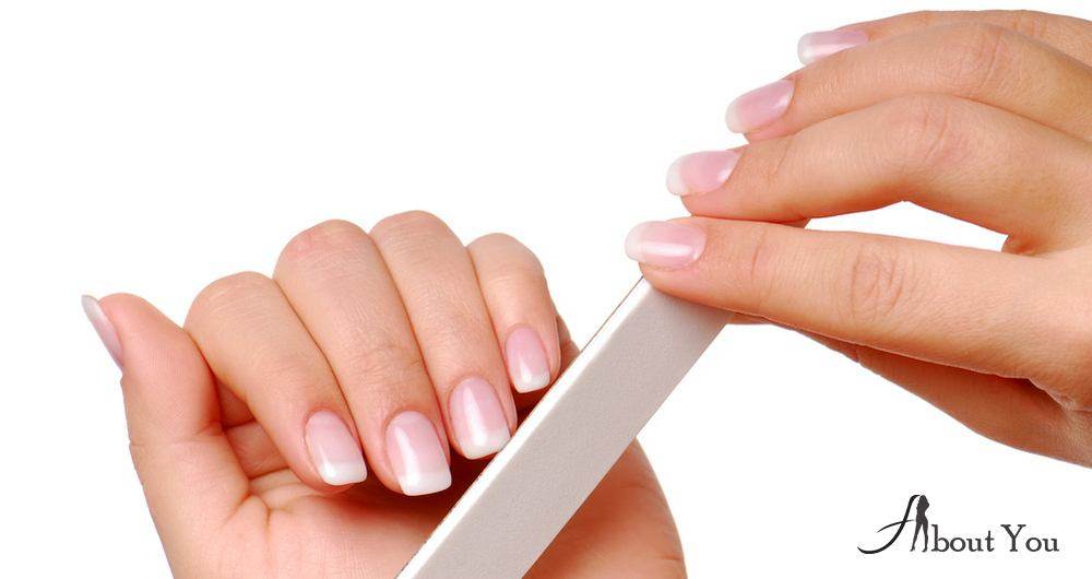 Пилкой начинайте подпиливать края ногтевых пластин. Выбор инструмента будет зависеть от состояния ногтей. Если они мягкие и слоятся, используйте мелко абразивную пилку. Жесткие подойдут только для обработки крепких ногтей.