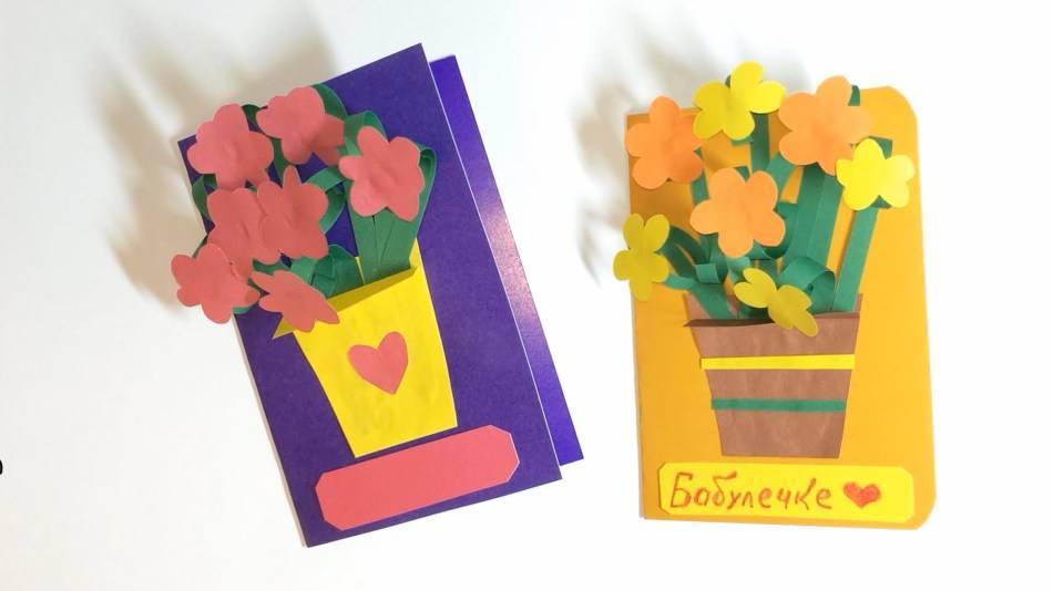 - Из цветного картона сделать 2 одинаковые заготовки горшков и склеить их между собой так, чтобы в них образовался карман, в который бы помещались букетики, вырезанные из цветной бумаги. Букет должен выглядеть, как вставка в горшок. Цветы должны быть только на верхней части букета, чтобы остальной картон был свободен для текста поздравления. В серединку каждого цветка приклеить цветной камешек. Вставить готовый букет с пожеланиями в горшок.