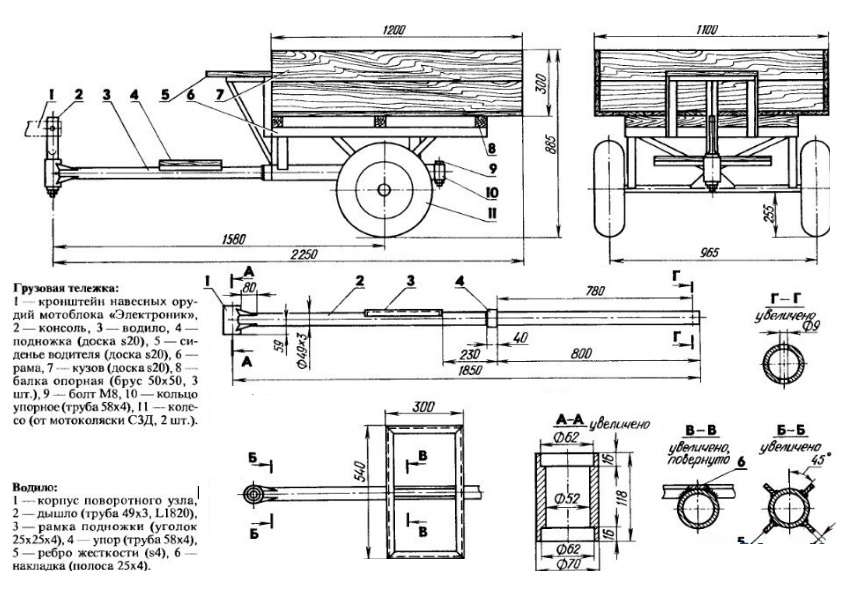 Работу с такой конструкцией необходимо начинать с произведения расчетов, и создания грамотного чертежа. Мотоблоки средних размеров имеют повышенную мощность, поэтому они легко транспортируют прицепные устройства массой до 500 кг.