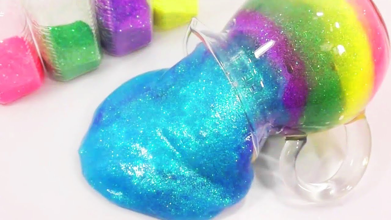 - При создании блестящего глосси-слайма используют обычное детское масло. Он готовится на базе классической игрушки, обладая основными ее качествами: мягкостью и равномерной плотной текстурой.