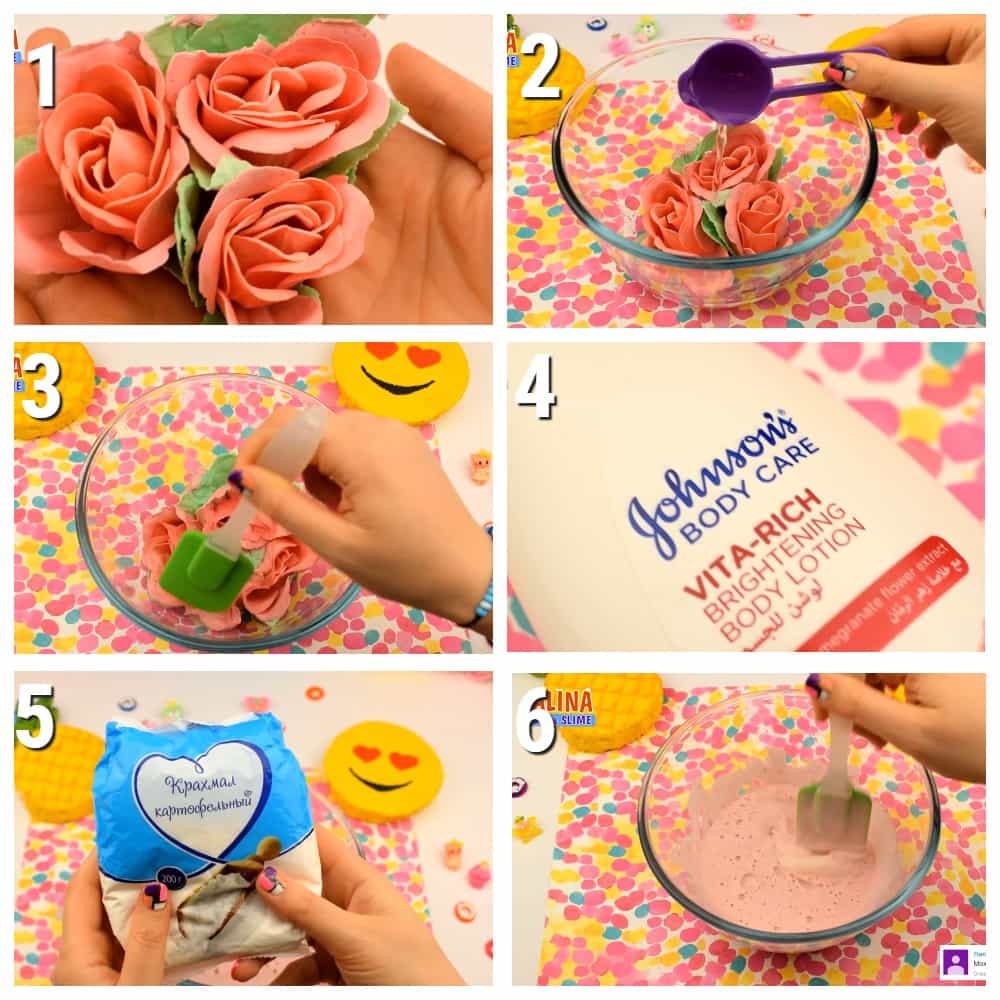 Основой будущего слайма будет мыло розочки, заливаем их теплой водой и перемешиваем до однородной массы, чтобы не осталось никаких комочков. Далее понадобится любое жидкое мыло, если мыла нету замените его на крем для рук или лосьон для тела johnson’s Baby, тщательно перемешиваем. Следующий ингредиент — картофельный крахмал, стоит не дорого и купить можно в продуктовом магазине. Крахмал можно заменить на детскую присыпку или же использовать кукурузный крахмал, мешаем до однородности.