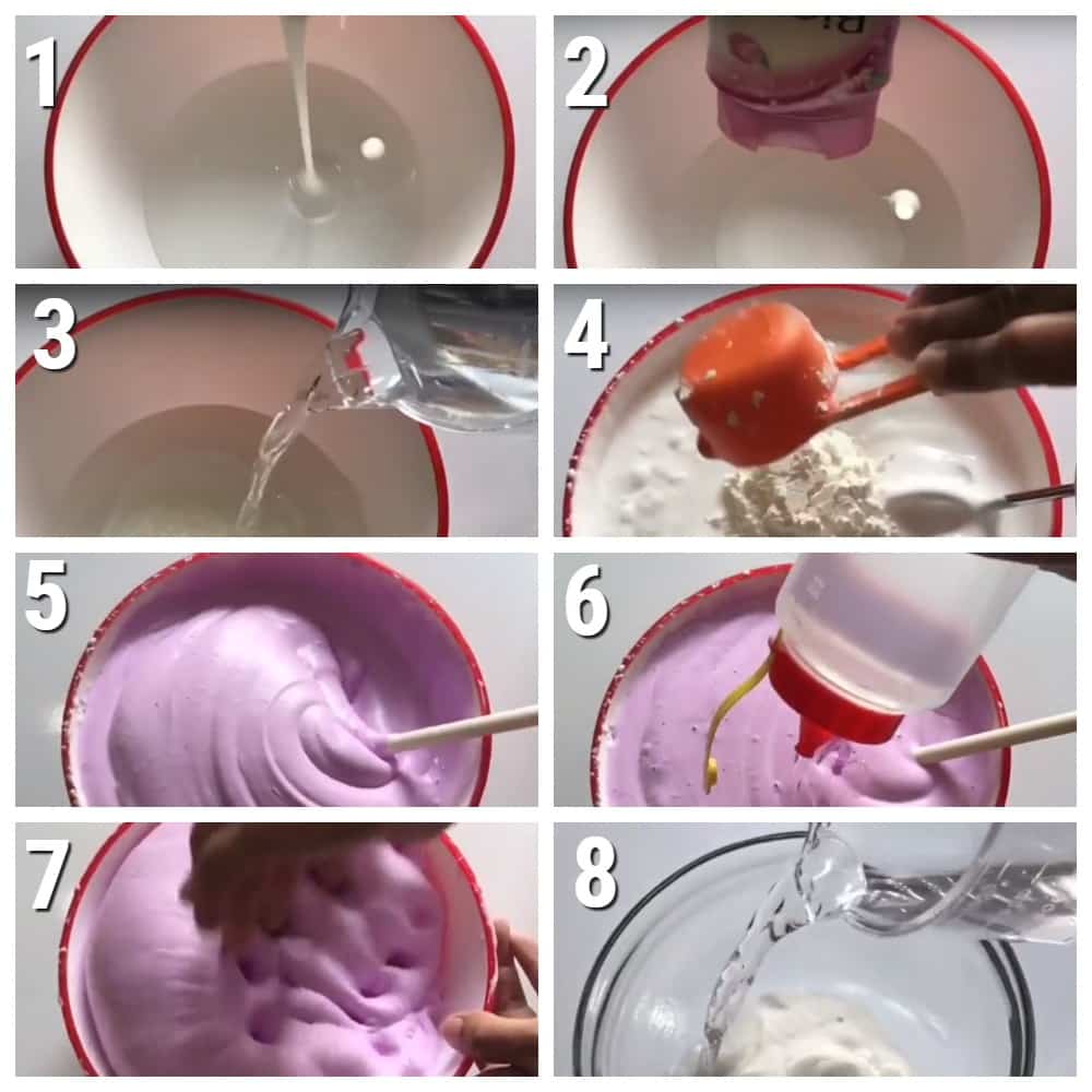 Оба вида клея должны быть работающими, так как их объем в рецепте достаточно велик. Крахмал подойдет картофельный или кукурузный. А вместо пены для бритья можно в отдельной посуде взбить венчиком жидкое мыло, шампунь с зубной пастой.