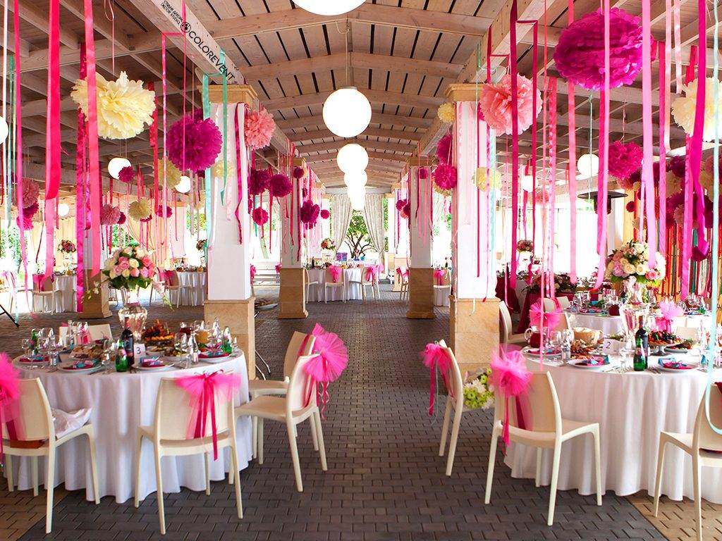 Иногда в роли главной темы выбирают один цвет. На фото ниже представлена свадьба в розовом цвете. Незамысловатый декор делает зал не просто праздничным, но поистине красивым: