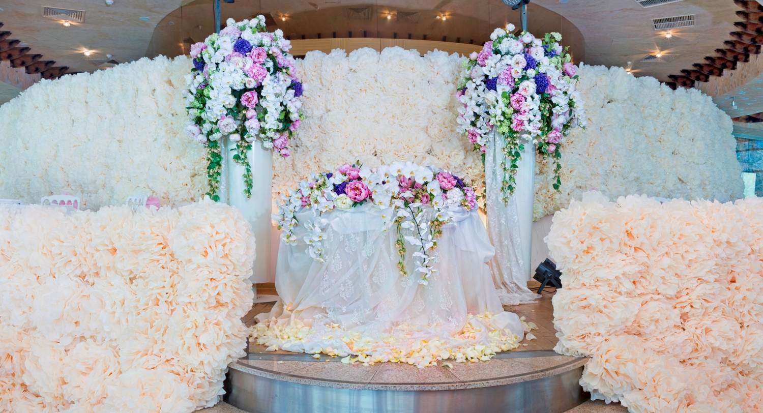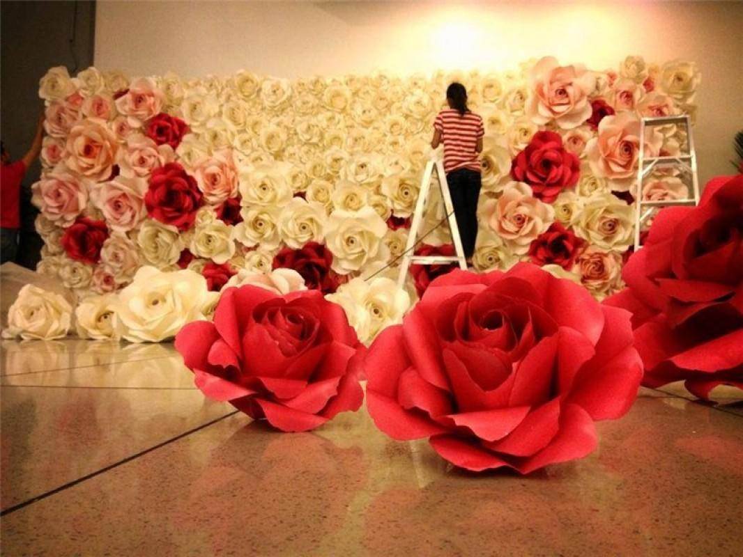 Цветами огромных размеров можно украсить стену банкетного зала, к примеру место для фотографии на память, либо фон молодоженов. Эффектно будут смотреться огромные бутоны роз лежащие на полу: