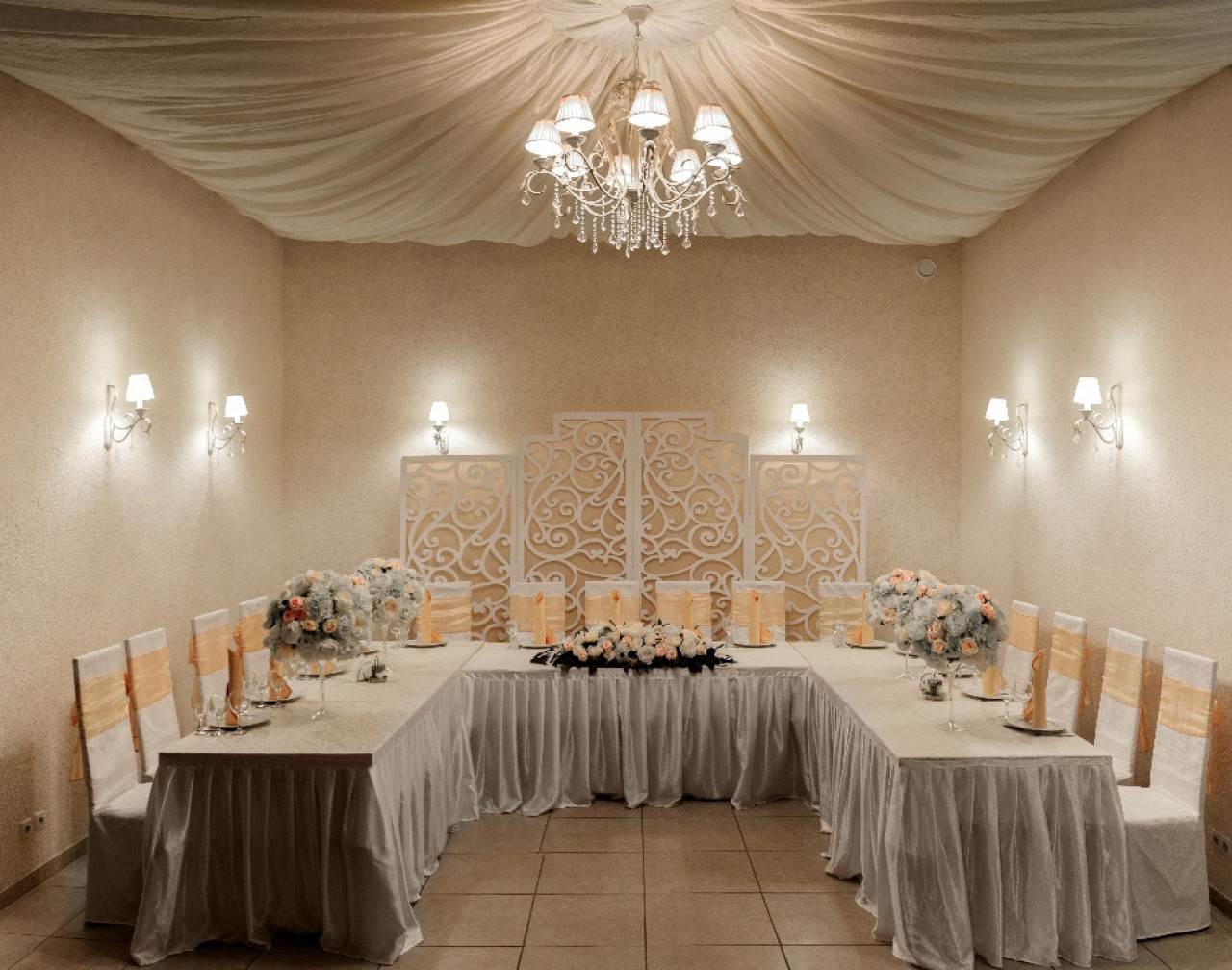 Банкетный зал, оформленный в светлых тонах, лишенный «лишних» деталей подчеркнёт элегантность брачующихся.