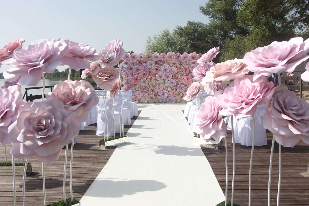 Оформление свадебного зала цветами может быть также сделано своими руками из бумажных цветов. Многие могут считать, что выглядит это дешево, а также связывать этот момент с суевериями. Однако, модные тенденции берут свое и огромные бумажные цветы не только прочно вошли в моду, но ими украшают залы, площадки для фотосессий, невесты добавляют подобные цветы в свадебные букеты.