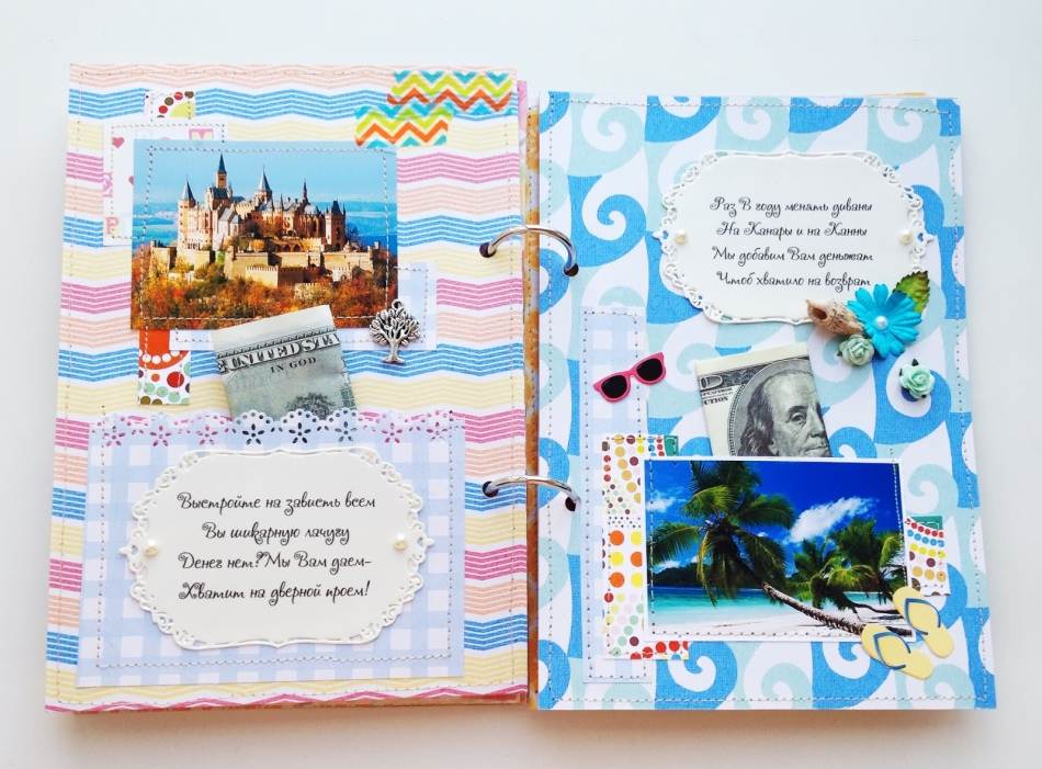 - Каждая страница должна содержать кармашек. Делается он из небольшого листа бумаги прямоугольной формы (форма может быть любой). Он приклеивается на страницу, но не полностью. Смазать клеем следует только три его стороны. Четвертая будет иметь прорезь, и будет служить местом для вкладывания денежных купюр. Украшения можно клеить как вокруг кармашка, так и сверху него