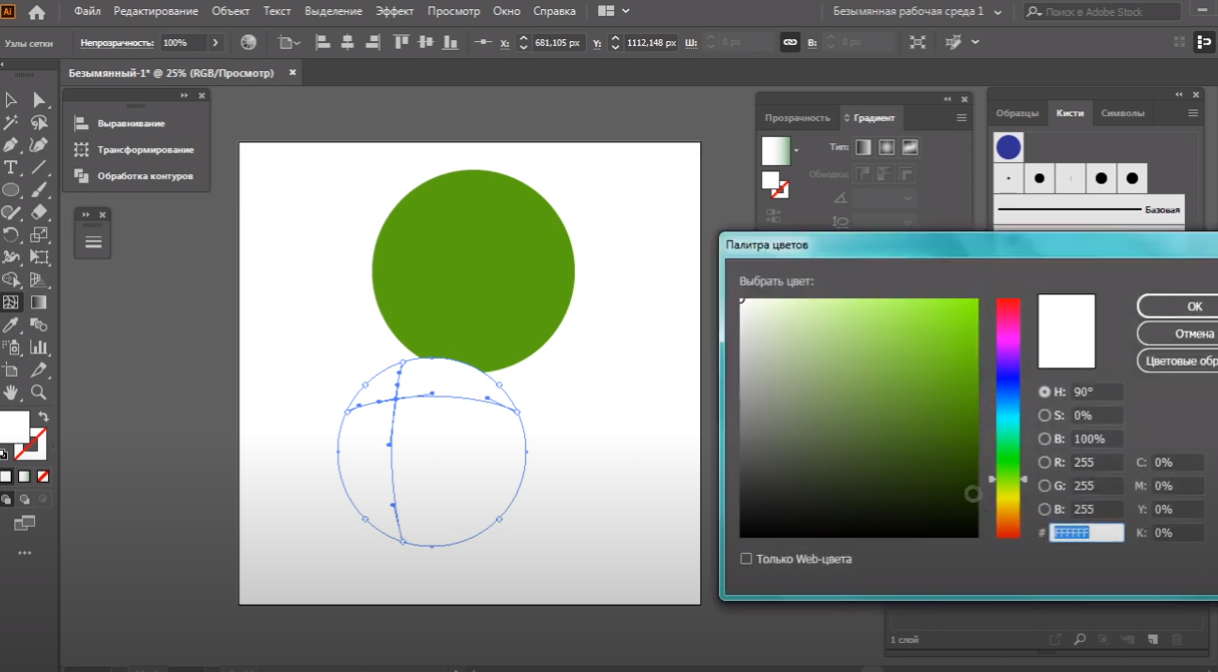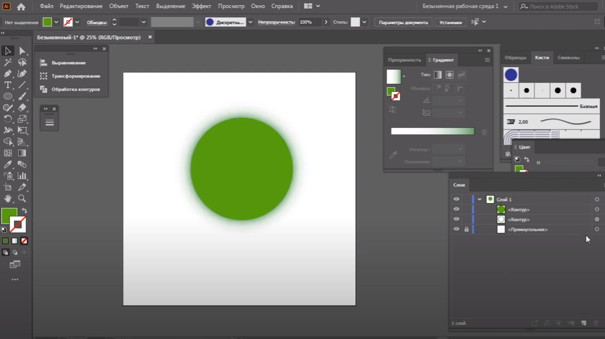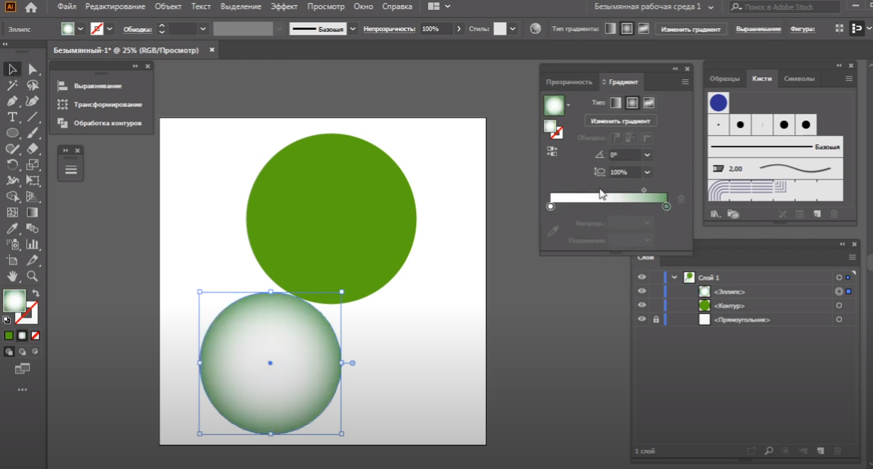 Для нашего шара мы используем эллипс (вызывается горячей клавишей L), который делаем примерно того же размера, как и сам объект. Но вертикально сужаем его, чтобы было понимание, что тень плоская и лежит под объектом. В зависимости от источника света тень может быть прямо под объектом, левее или правее. Чем ниже источник света, тем уже она у нашего шара. Для придания большей правдоподобности тени в “Иллюстраторе” можно поэкспериментировать с градиентами и прозрачностью.