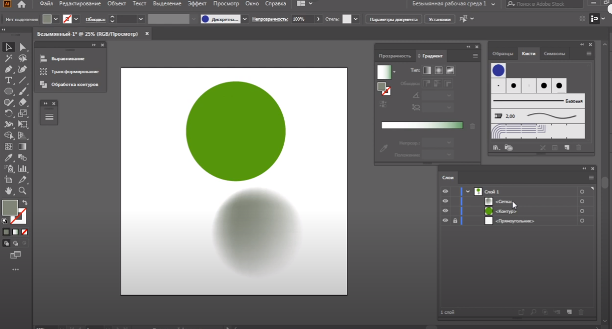 Один из способов того, как сделать тень в “Иллюстраторе”, рассмотрим на примере простого объекта. Например, шара. Сначала рассмотрим тень, которую объект отбрасывает на поверхность, на которой находится. Для создания простой тени от простых объектов достаточно использовать те же геометрические фигуры.