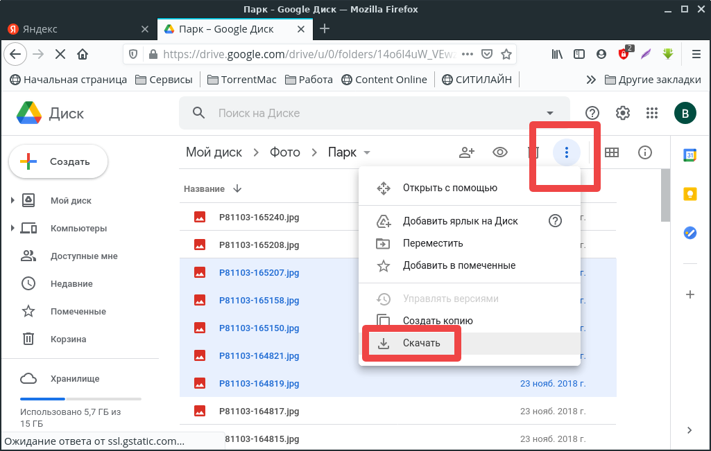 Теперь нужно повторить процедуру на другом компьютере. Только здесь вы будете не загружать фотографии, а скачивать. Откройте «Диск», найдите фотки. Выделите их и нажмите «Скачать».