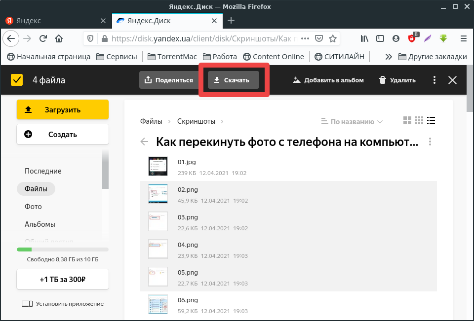 - Перейти в директорию с фото, выделить необходимые и нажать «Скачать».