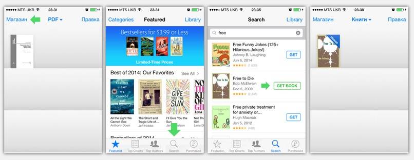 Чтобы попасть в этот раздел, зайдите в iBooks, в левом верхнем углу будет кнопка «Магазин», нажав на которую попадаешь в книжный. Затем Вы имеете возможность добавить критерии поиска — жанр, тематика, рейтинг, также можно читать краткое описание к каждому файлу.