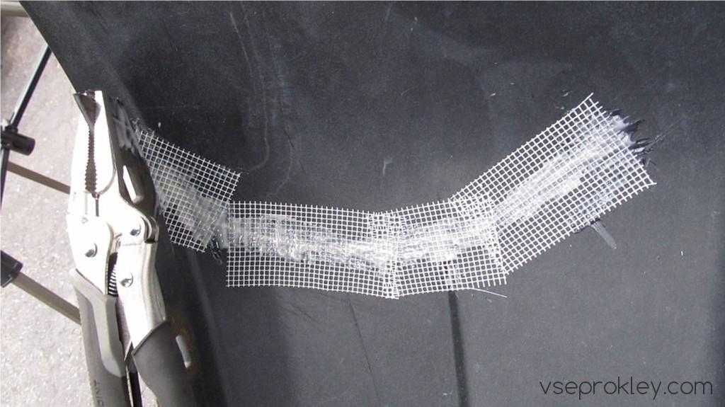 - термореактивный материал, заделывать трещины на нём, лучше используя специальное стекловолокно или армирующую пластиковую сетку, которая должна пропитываться эпоксидной смолой, так как при воздействии высокой температуры на этот пластик он не будет плавиться.